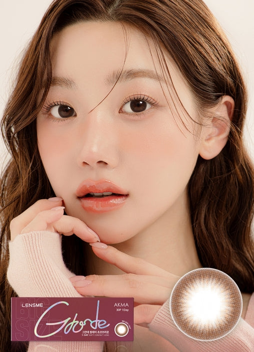 Lensme AKMA Grande Choco Brown is a daily silicone hydrogel lens with a soft choco-milk brown tone and a large 13.9 mm graphic diameter. The diffused ring and gentle gradient create big, expressive eyes while keeping the overall look natural enough for everyday wear.