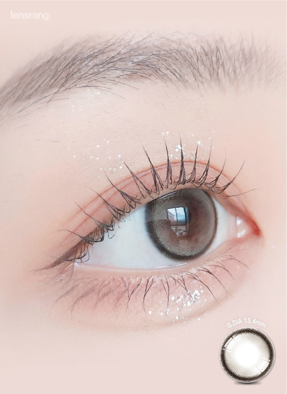 Lensrang BeBe Gray layers a soft greige iris print, thin translucent edge, and bright inner highlight to give the eye a glossy, dimensional glow. The 13.4 mm graphic diameter subtly enlarges while keeping your natural pupil and base color visible, creating a clean, natural gray look that works for daily wear and close-up photos.