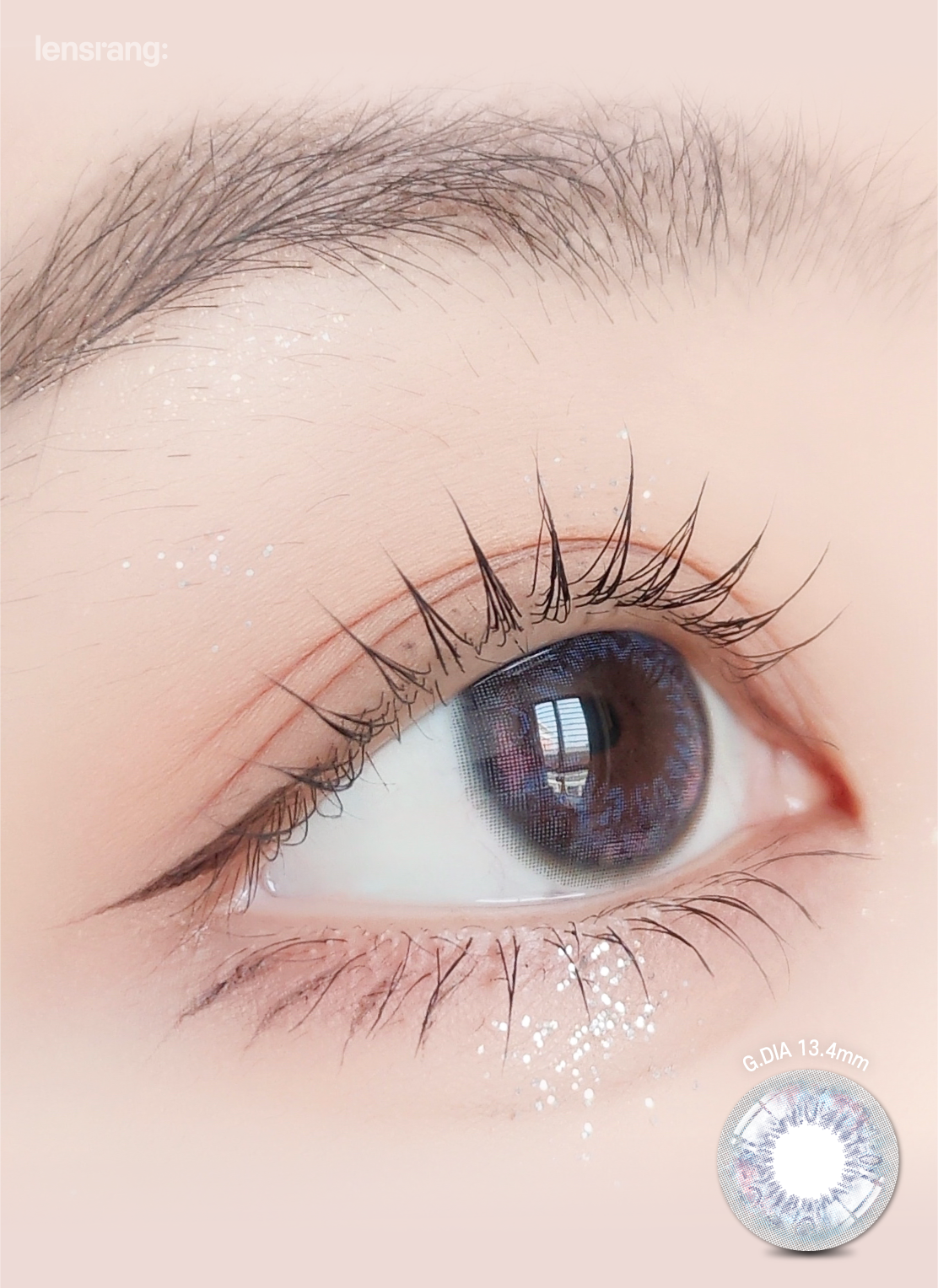 Blue-gray with subtle pink swirls and a defined limbal ring creates a luminous, dimensional look. The 13.4 mm graphic enlarges noticeably while staying wearable.