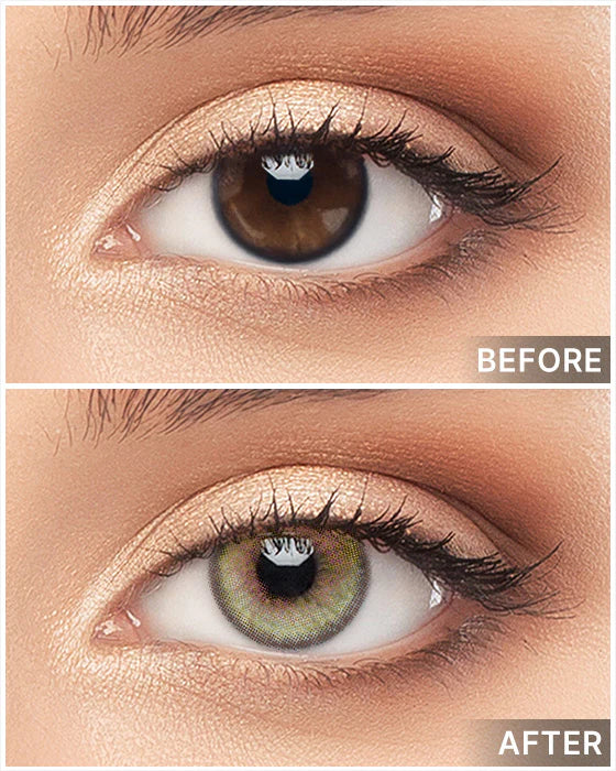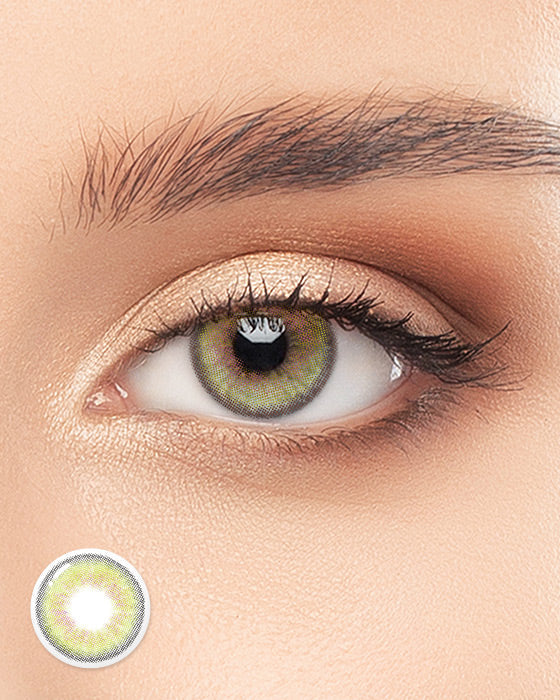 Subtle olive gradation and a slim 13.1 mm graphic ring blend with your iris for a fresh, natural green tone and gentle, wearable enlargement.
