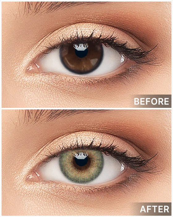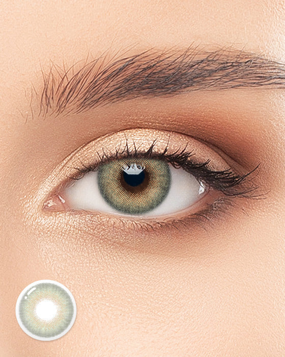 Soft olive-green gradient with a refined dotted ring. The 13.3 mm graphic on a 14.5 mm lens adds believable enlargement while the translucent center keeps the pupil zone clear for a bright, natural look.