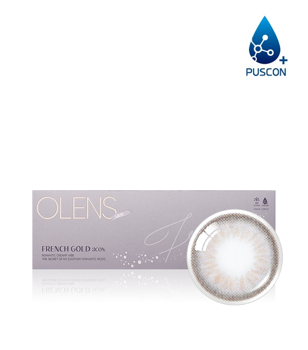 OLENS 1 Day French Gold 3con Gray 日拋隱形眼鏡,設計低調卻充滿優雅感。13.1mm 的著色直徑貼近自然瞳孔大小,帶來細緻自然的放大效果,不會過度誇張。奶油感的外圈柔和勾勒虹膜,呈現自然光澤而不突兀。採用 PUSCON 材質並含有 48% 含水量,兼顧舒適與時尚。溫潤的灰色調能自然融入眼色,展現時髦又高級的質感,同時維持自然無縫的的效果。