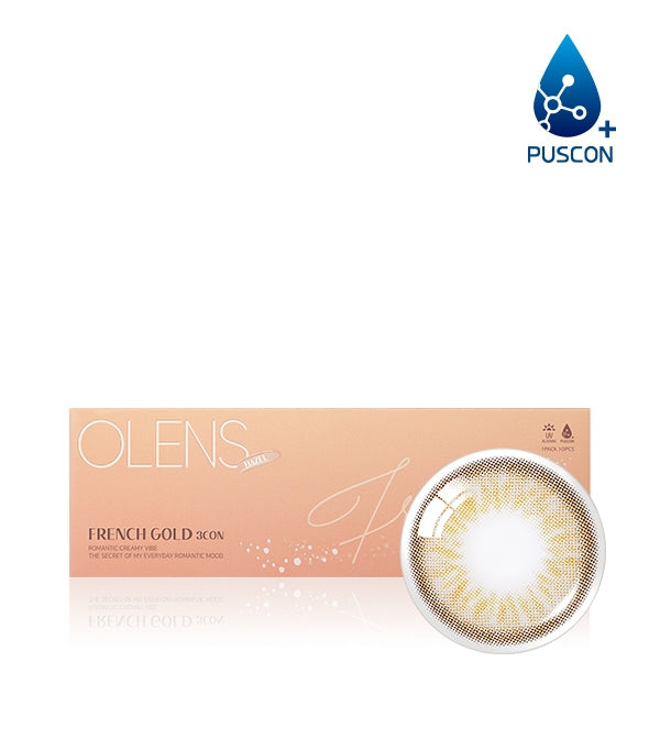 OLENS 1 Day French Gold 3con Hazel 日拋隱形眼鏡,以細膩的設計帶來自然又高級的放大效果。鏡片採用 Puscon 材質,搭配 48% 含水量,保濕透氣兼顧舒適度。13.1mm 的著色直徑結合 14.2mm 的總直徑,能自然修飾瞳孔比例,營造細緻卻不誇張的放大感。奶油感外圈柔化虹膜邊界,呈現溫柔光澤;暖棕榛色搭配淡金環設計,完美襯托日常妝容。優雅又實用,讓眼神自然散發迷人魅力。