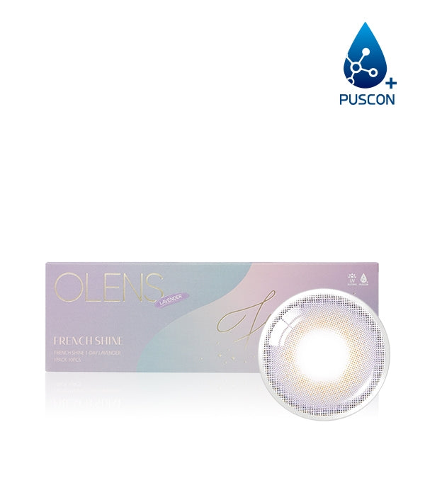 OLENS 1-Day French Shine Lavender 日拋隱形眼鏡將先進的 PUSCON 水凝膠與 48% 含水量結合,搭配細緻的薰衣草金色漸層,呈現自然又閃耀的眼神。精準尺寸設計(直徑 14.2mm、著色直徑 13.2mm、基弧 8.7mm),並以衛生的 10 片日拋包裝提供,度數範圍涵蓋 0.00 至 -8.00D,兼顧美觀與全天舒適配戴。