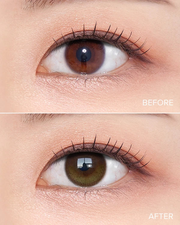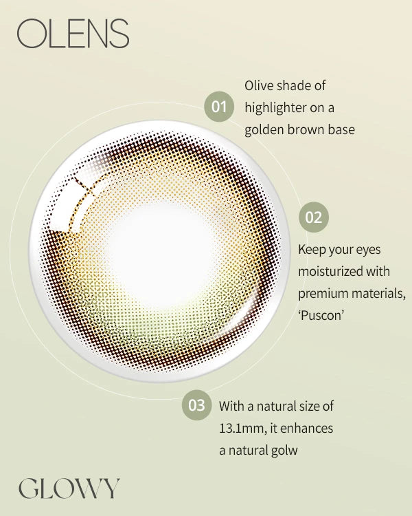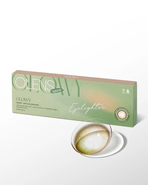 Glowy 1-Day Golden Olive pairs an olive-gold eyelighter sheen with a neat outer line. Its 13.1 mm graphic and Puscon build deliver a clean, luminous enlargement that stays comfortable for day-long wear.