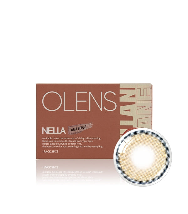 Nella Ash Beige 月拋隱形眼鏡以柔和的灰米色放射漸層搭配細緻的外環設計,為雙眼增添自然層次感。13.3mm 的著色直徑比例恰到好處,能輕柔放大虹膜,呈現不費力的優雅氣質。