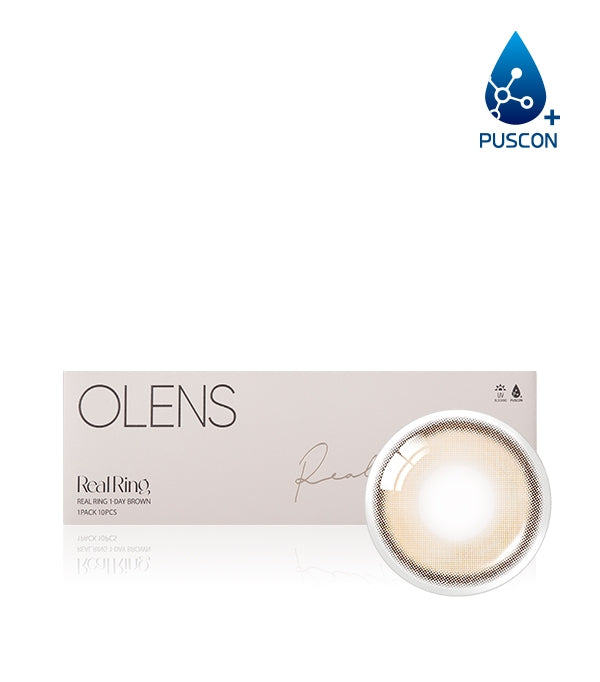 Experience effortless eye enhancement with Olens Real Ring 1 Day Brown daily disposable lenses. The deep dark Real Ring border frames your iris in a soft charcoal outline, creating a luminous tone-up effect that makes your eyes appear brighter and more defined. A 12.5 mm graphic diameter subtly enlarges the iris for a natural big-eye look without appearing artificial. Crafted from Puscon material containing 48% water, these lenses lock in moisture and allow oxygen flow for all-day hydration, reducing dryness during extended screen time or outdoor activities. Engineered with a 14.2 mm total diameter and an 8.7 mm base curve, they provide a precise, slip-free fit that stays comfortable from morning meetings to evening plans.